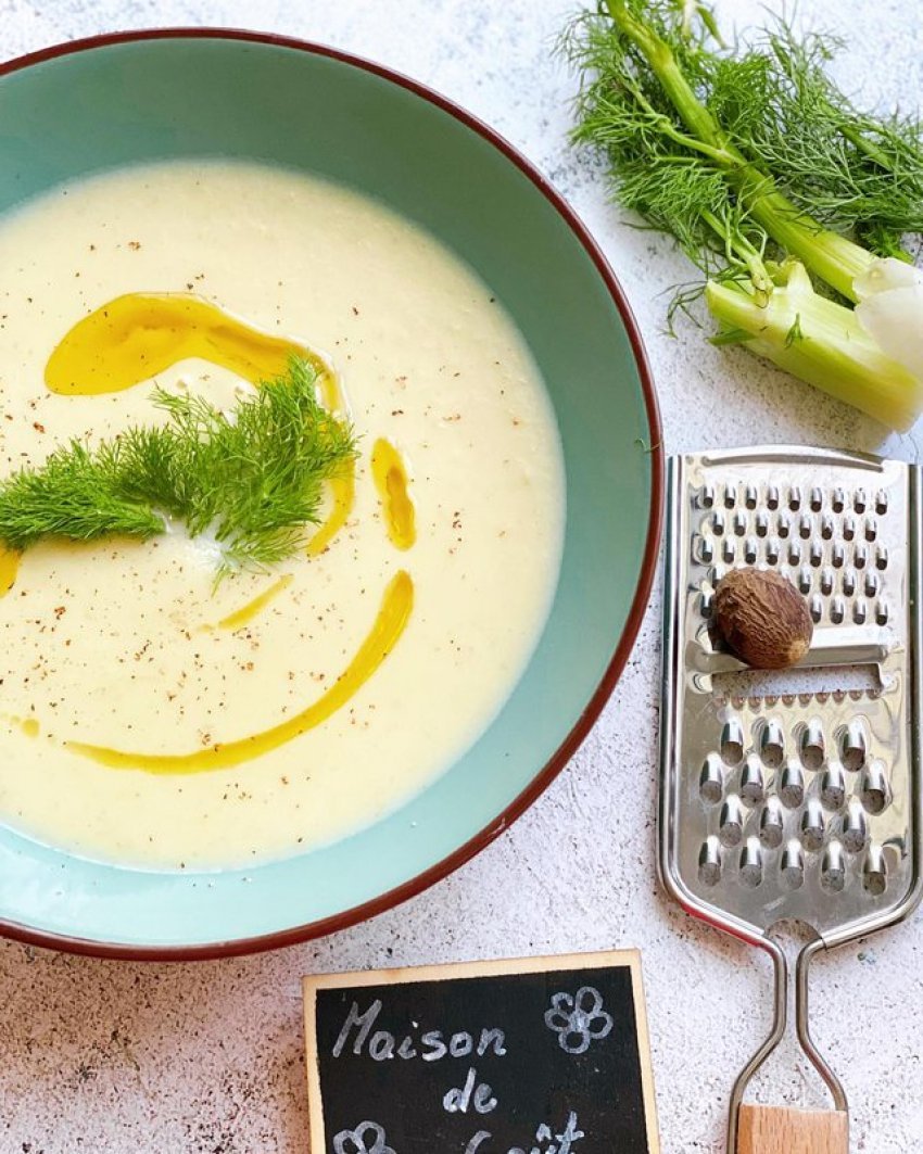 2 finokë, 2 patate, 2 degë selino, 1 mollë, gjysmë qepe e thatë, pak qumësht, ujë, kripë, piper, vaj ulliri/gjalpë dhe arrë moskat.