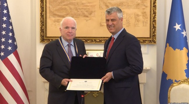 “Ju me punën dhe angazhimin për çlirimin e Kosovës, dëshmuat se liria nuk është privilegj i të fortit, por e drejtë fundamentale e të gjitha kombeve, e të gjitha vendeve”, tha Thaçi, duke i ndarë medaljen presidenciale senatorit republikan, McCain.