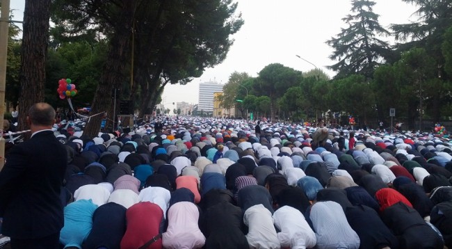 Mijëra besimtarë u falën në shesh, nën lutjen e drejtuar nga kreu i Komunitetit Mysliman të Shqipërisë, Skënder Bruçaj.