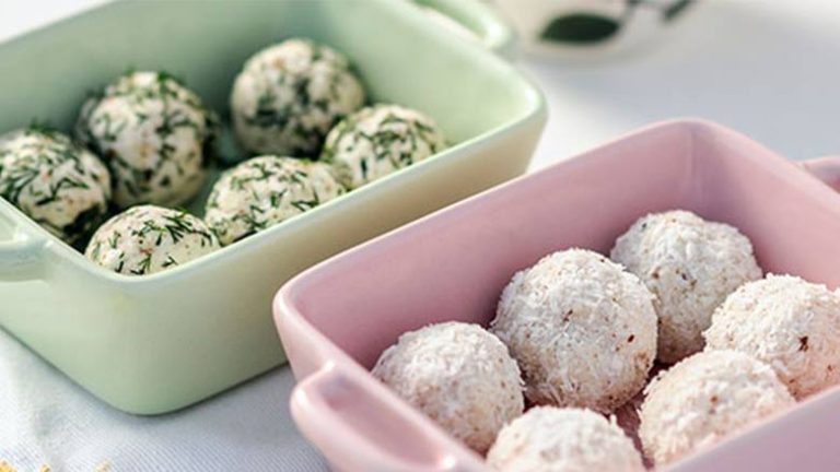 Formojmë topa të vegjël, më pas disa prej tyre i lyejmë me arrë kokosi të grirë dhe disa të tjerë me gjethe kopër të grira imët.