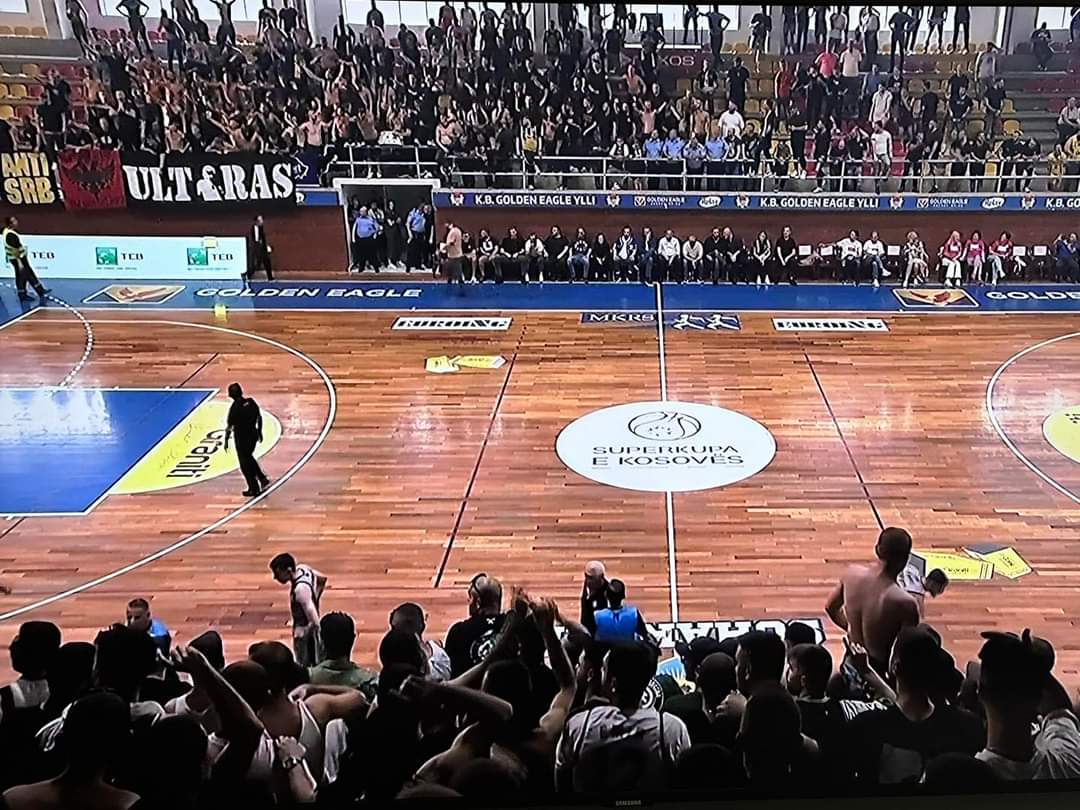 Përndryshe, gjatë ndeshjes pati disa incidente, teksa u larguan edhe tifozët e klubit mitrovicas nga palestra, pasi këta të fundit gjuajtën gjësende brenda në parket.