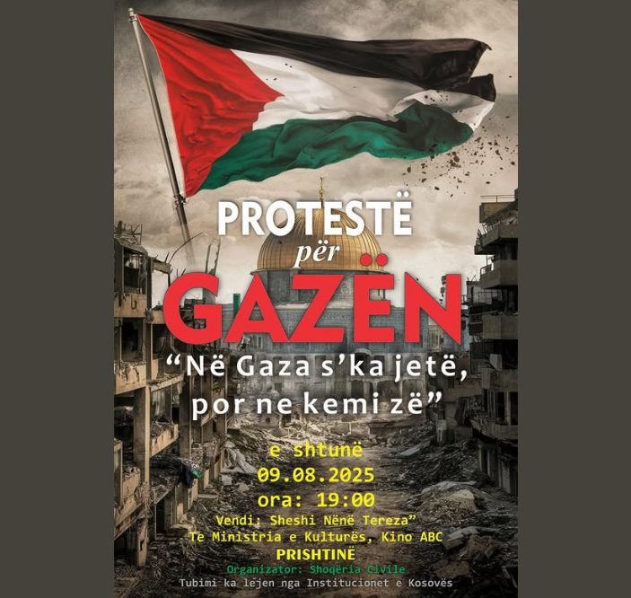 Tubim paqësor në solidaritet me Gazën. 30/07/2025 Tubim paqësor në solidaritet me Gazën. “Në Gaza s’ka jetë – por ne kemi zë.” 📅 E shtunë, 09.08.2025 🕒 Ora 19:00 📍 Sheshi “Nënë Tereza”, Prishtinë (tek Ministria e Kulturës, afër Kino ABC) Share this: Click to share on Facebook (Opens in new window) Facebook Click to share on X (Opens in new window) X