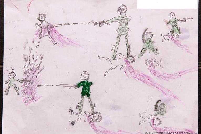 Siç mund të shihet qartë, ajo mban firmën e UNICEF-it dhe është vizatimi i një fëmije që e përshkruan naivisht me laps, por fenomenalisht me fabul, atë çfarë po ndodh në një tokë budistësh ku jetojnë dhe muslimanë. /Mesazhi/
