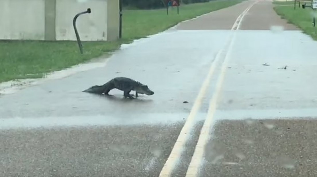 Një aligator i madh ka shkaktuar panik në një rrugë të përmbytur nga shiu në Teksas i cili ka dalë në rrugë për të kapur një bretkosë.
